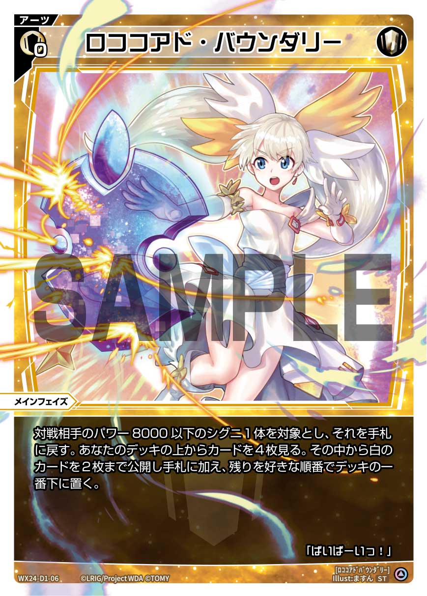 首頁 / WIXOSS / WX24-D1 / WX24-D1-06 ロココアド・バウンダリー「白色 必殺 主要階段 主階」 WX24-D1-06 ロココアド・バウンダリー「白色 必殺 主要階段 主階」$1.00 WX24-D1-06 ロココアド・バウンダリー「白色 必殺 主要階段 主階」 數量 加入購物車 貨號: WX24-D1-06 分類: WX24-D1 描述 描述 主要階段 對方1隻力量8000以下的精靈作對象,將其返回手牌。從我方牌組上方查看4張卡牌。將其中最多2張白色卡牌公開並加入手牌,剩下的按任意順序放置到牌組下方。 相關商品 WX24-D1-21 コードハート Pンライト「白色 精靈 奏械:電機 LV3 有LB」 $1.00 加入購物車 WX24-D1-02 三日月の巫女 タマヨリヒメ「白色 分身 タマ(小玉) LV1 」 $1.00 加入購物車 WX24-D1-17 羅星 リンクス「白色 精靈 奏羅:宇宙 LV2 有LB」 $1.00 加入購物車 WX24-D1-09 ドロー・エンハンス「無色 必殺 主要階段 主階」 $1.00 加入購物車