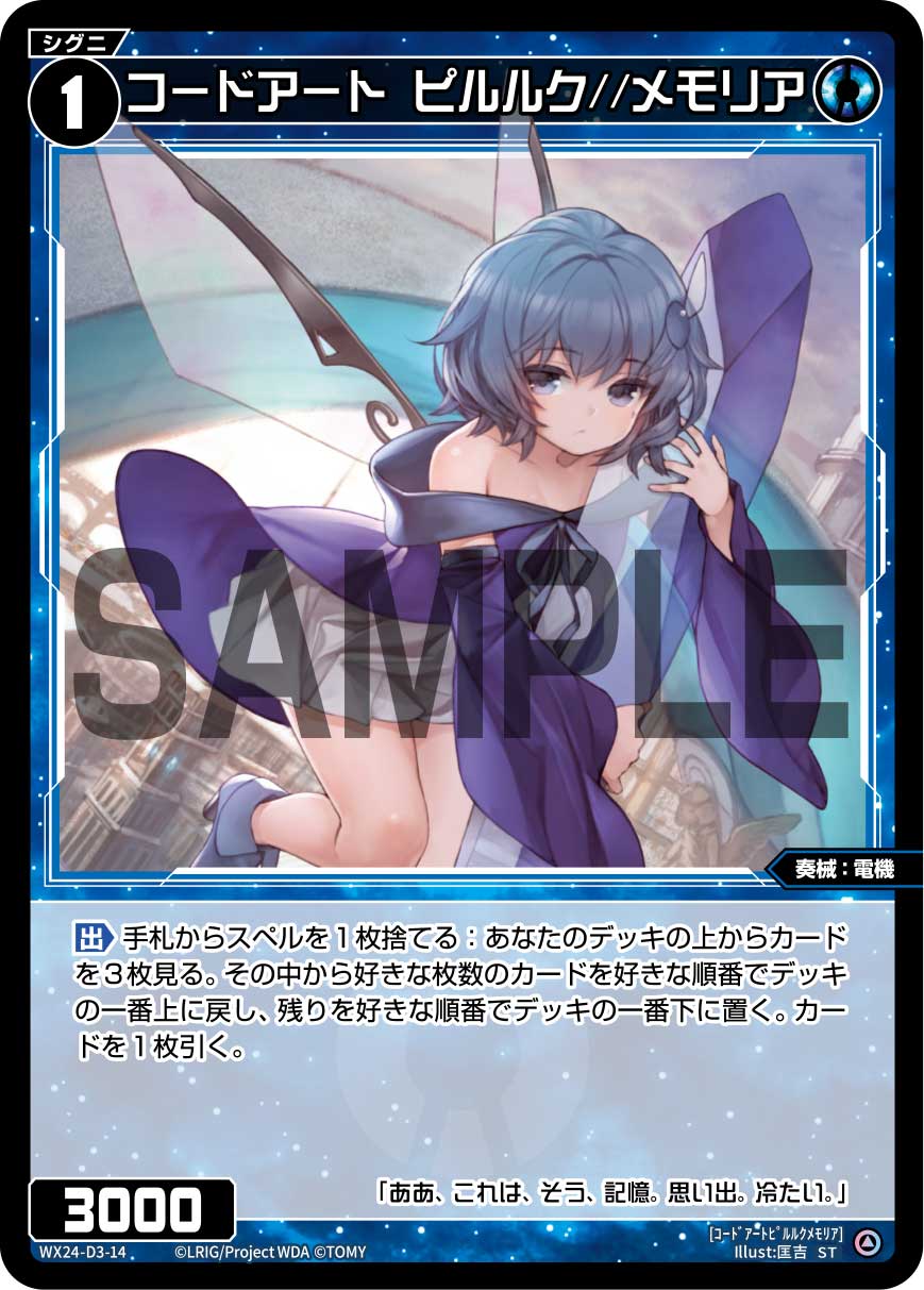 首頁 / WIXOSS / WX24-D3 / WX24-D3-14 コードアート ピルルク//メモリア「藍色 精靈 奏械:電機 LV1 無LB」 WX24-D3-14 コードアート ピルルク//メモリア「藍色 精靈 奏械:電機 LV1 無LB」$1.00 WX24-D3-14 コードアート ピルルク//メモリア「藍色 精靈 奏械:電機 LV1 無LB」 數量 加入購物車 貨號: WX24-D3-14 分類: WX24-D3 描述 描述 「出」從手牌捨棄1張魔法:從我方牌組上方查看3張卡牌。將其中任意張數的卡牌任意順序放回牌組上方,剩下的按任意順序放回牌組下方。抽1張牌。 相關商品 WX24-D3-23 大幻蟲 アロス・ピルルク//メモリア「藍色 精靈 奏生:凶蟲 LV3 無LB」 $1.00 加入購物車 WX24-D3-15 コードアート Jユブナイル「藍色 精靈 奏械:電機 LV2 無LB」 $1.00 加入購物車 WX24-D3-21 羅輝石 ロイヤルブルー「藍色 精靈 奏羅:寶石 LV3 有LB」 $1.00 加入購物車 WX24-D3-03 コード・ピルルク・M「藍色 分身 ピルルク(皮璐璐可) LV2 」 $1.00 加入購物車