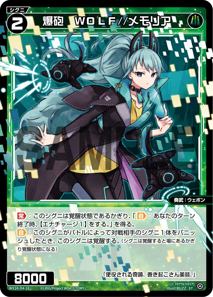 首頁 / WIXOSS / WX24-D4 / WX24-D4-18 爆砲 WOLF//メモリア「綠色 精靈 奏武:ウェポン(武器) LV2 無LB」 WX24-D4-18 爆砲 WOLF//メモリア「綠色 精靈 奏武:ウェポン(武器) LV2 無LB」$1.00 WX24-D4-18 爆砲 WOLF//メモリア「綠色 精靈 奏武:ウェポン(武器) LV2 無LB」 數量 加入購物車 貨號: WX24-D4-18 分類: WX24-D4 描述 描述 「常」:此精靈是覺醒狀態時,獲得「自:我方回合結束時,【能量填充1】。」。 「自」: 此精靈因戰鬥破壞對方1隻精靈時,此精靈會覺醒。 相關商品 WX24-D4-03 二ノ娘 緑姫「綠色 分身 綠子 LV2 」 $1.00 加入購物車 WX24-D4-21 羅菌姫 アミノサン「綠色 精靈 奏羅:微菌 LV3 有LB」 $1.00 加入購物車 WX24-D4-08 守破離「綠色 必殺 攻擊階段 攻階」 $1.00 加入購物車 WX24-D4-15 幻闘獣 ミスザク「綠色 精靈 奏生:地獸 LV2 無LB」 $1.00 加入購物車