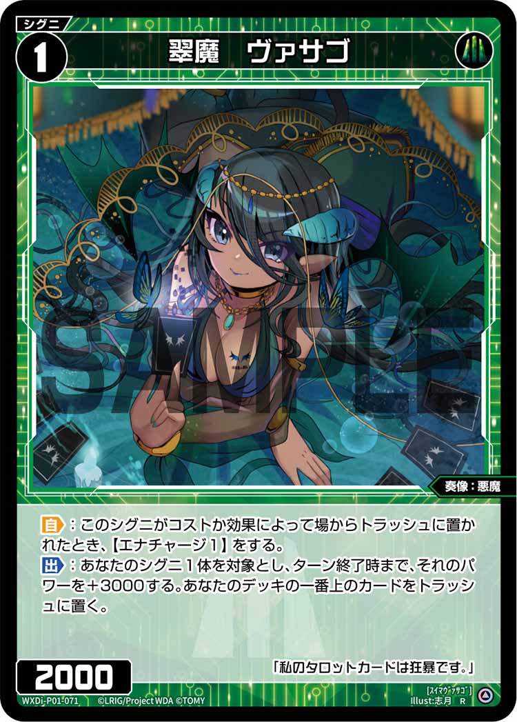 首頁 / WIXOSS / WXDi-P01 / WXDi-P01-071 翠魔 ヴァサゴ「綠色 精靈 奏像:惡魔 LV1 無LB」 WXDi-P01-071 翠魔 ヴァサゴ「綠色 精靈 奏像:惡魔 LV1 無LB」$1.00 WXDi-P01-071 翠魔 ヴァサゴ「綠色 精靈 奏像:惡魔 LV1 無LB」 數量 加入購物車 貨號: WXDi-P01-071 分類: WXDi-P01 描述 描述 「自」:此精靈因費用或效果從場上放置到廢棄區時,【能量填充1】。 「出」:我方1隻精靈作對象,直到回合結束時為止,將其力量+3000。我方牌組頂1張卡牌放置到廢棄區。 相關商品 WXDi-P01-020 VJ.WOLF-MIRAGE「綠色 輔助分身 WOLF(羅羅) LV2 」 $1.00 加入購物車 WXDi-P01-005 NIGHTMARE■STEP「黑色 綠色 Piece 」 $1.00 加入購物車 WXDi-P01-013 レイ*絶対零度「藍色 輔助分身 レイ(令) LV2 」 $1.00 加入購物車 WXDi-P01-015 DJ.LOVIT-W-SCRACH「紅色 輔助分身 LOVIT(美美) LV1 」 $1.00 加入購物車